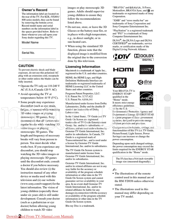 Sony KDL-60NX810 60NX801 60NX800 55NX811 55NX810 52NX800 46NX810 (24 pages) TV Operating Manual