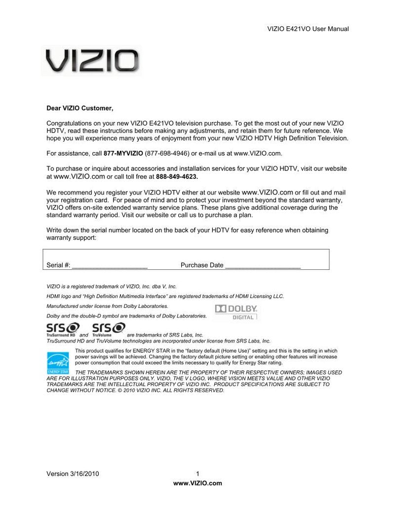 Vizio E421V0 TV Operating Manual