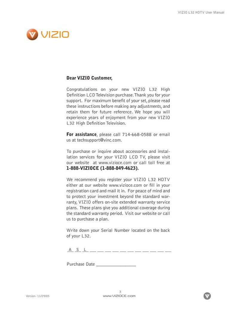 Vizio HDTVL32 TV Operating Manual