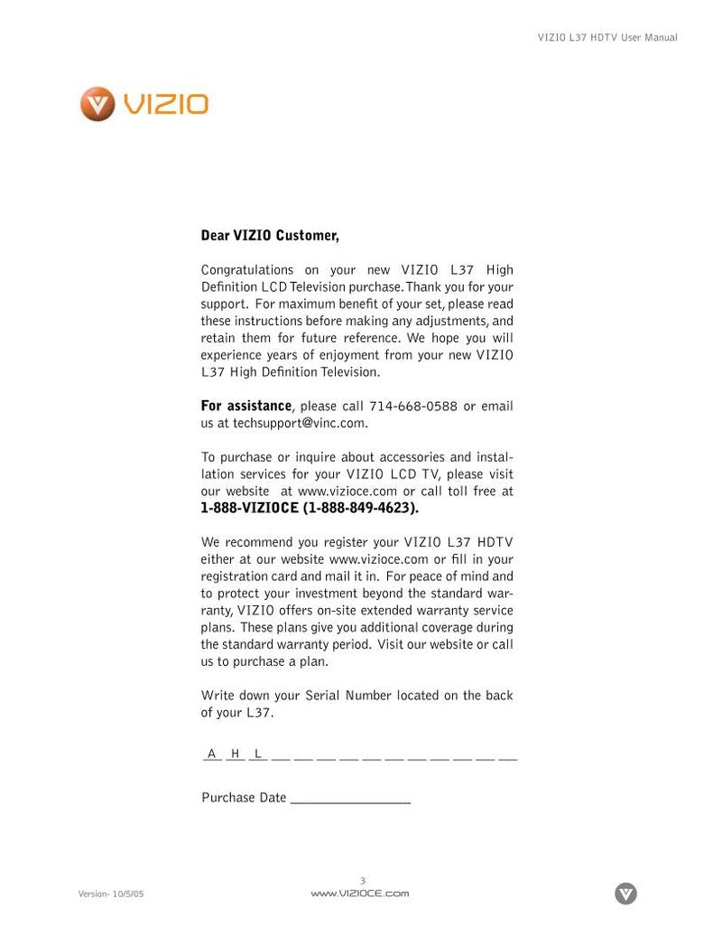 Get equipped with the detailed instructions for Vizio L37HDTV TV Operating Manual, brought to you by Vizio. This Operating Manual is an invaluable resource for understanding and utilizing your equipment. This manual spans 81 pages. Available now at Manuali in both professional print and digital formats.