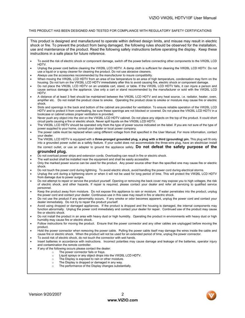 Vizio VW26LHDTV10F VW26LHDTV20F TV Operating Manual