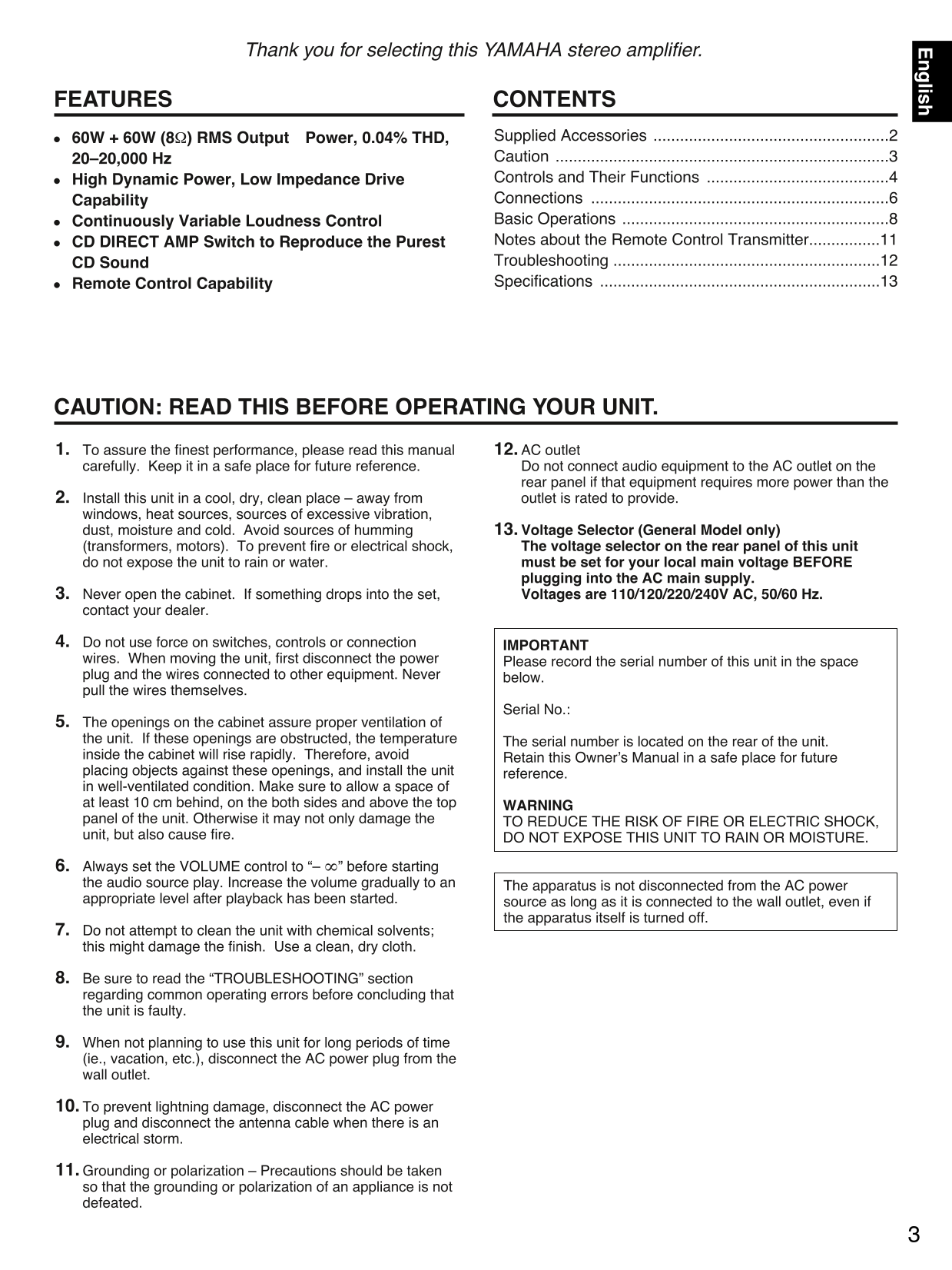 Yamaha AX-390 Amplifier Owner's/ User Manual (Pages: 14)