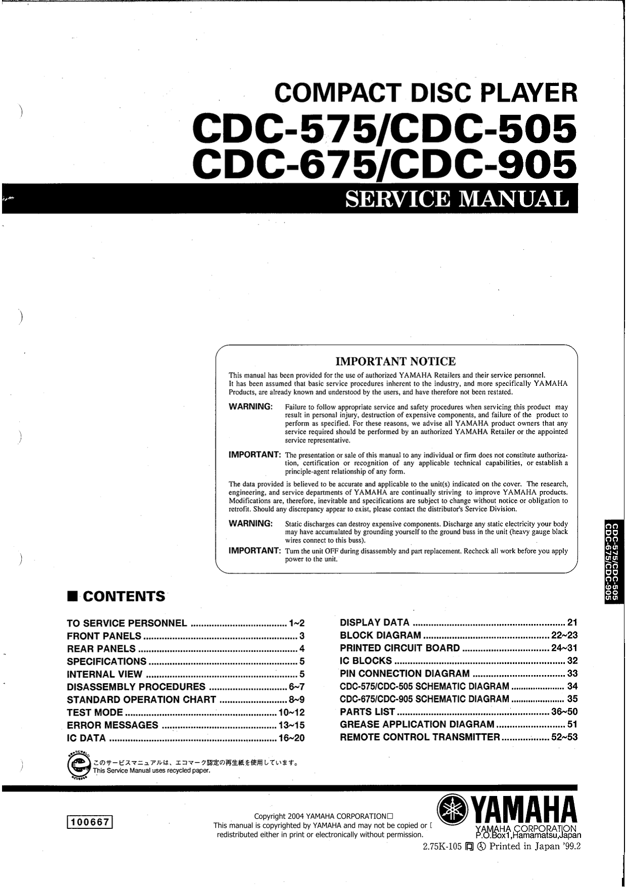 Yamaha CDC-505, CDC-575, CDC-675 & CDC-905 CD Player Service Manual (Pages: 50)